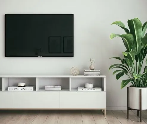 - Настенное. Самый популярный способ установки телевизора. Фиксация на стене освобождает место на поверхности мебели. Неподвижные крепления фиксируют телевизор в одном положении, в то время как подвижные системы позволяют его поворачивать, наклонять и выдвигать в нужном направлении.